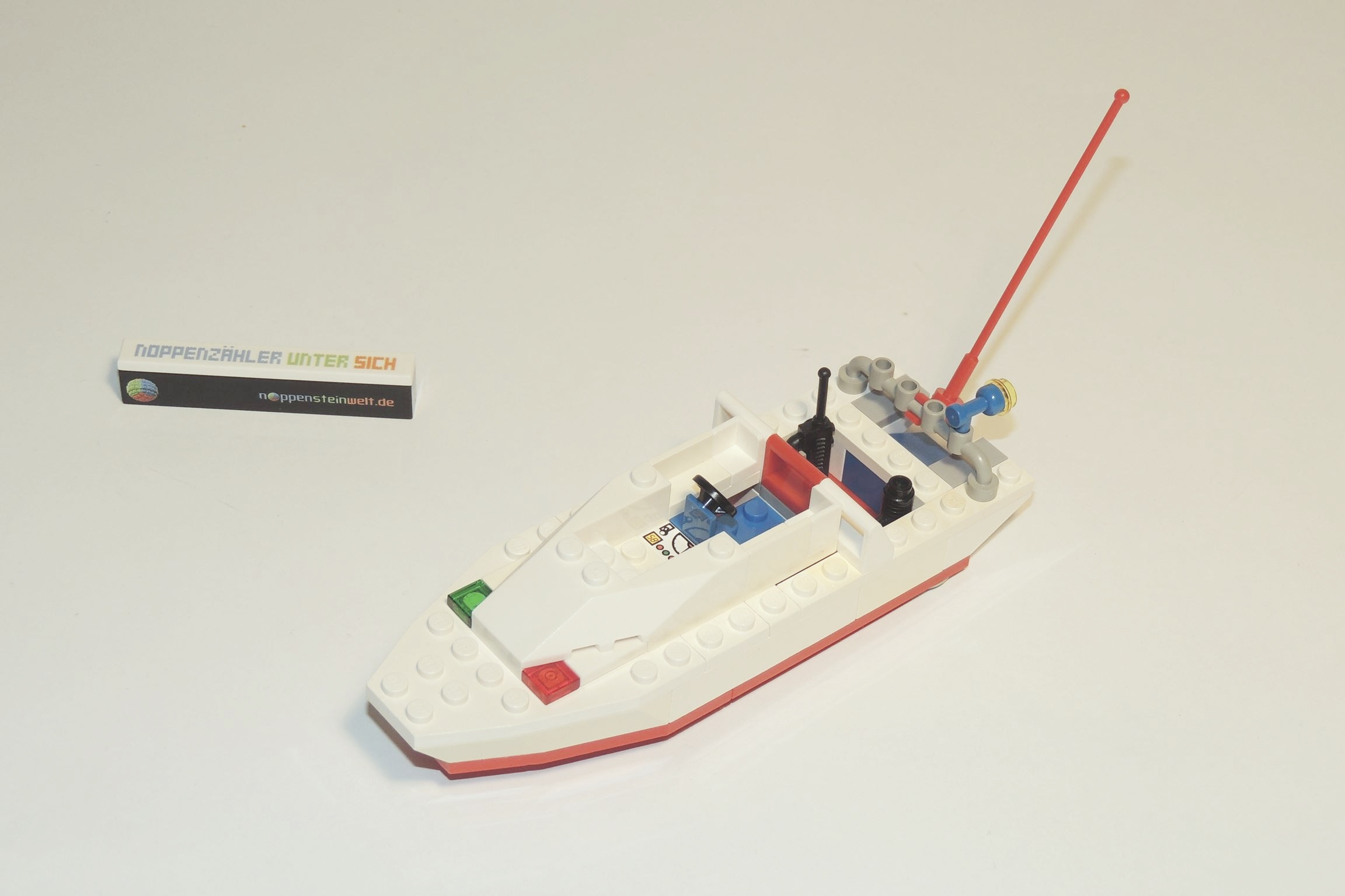Der sportliche Charakter des Küstenwachen-Boots soll schnelles Eingreifen signalisieren als Ersthelfer vor Ort, man bekommt zwei Minifiguren unter. Einmal den Bootsführer und hinten stehend einen weiteren Küstenwachler. Dem geschulten Auge wirds auffallen, zwei Aufkleber fehlen mir hier mit dem Küstenwachen-Logo auf den 1×2×1 Panel in weiß unter den Seitenenden der Scheibe. Stört mich nicht wirklich.